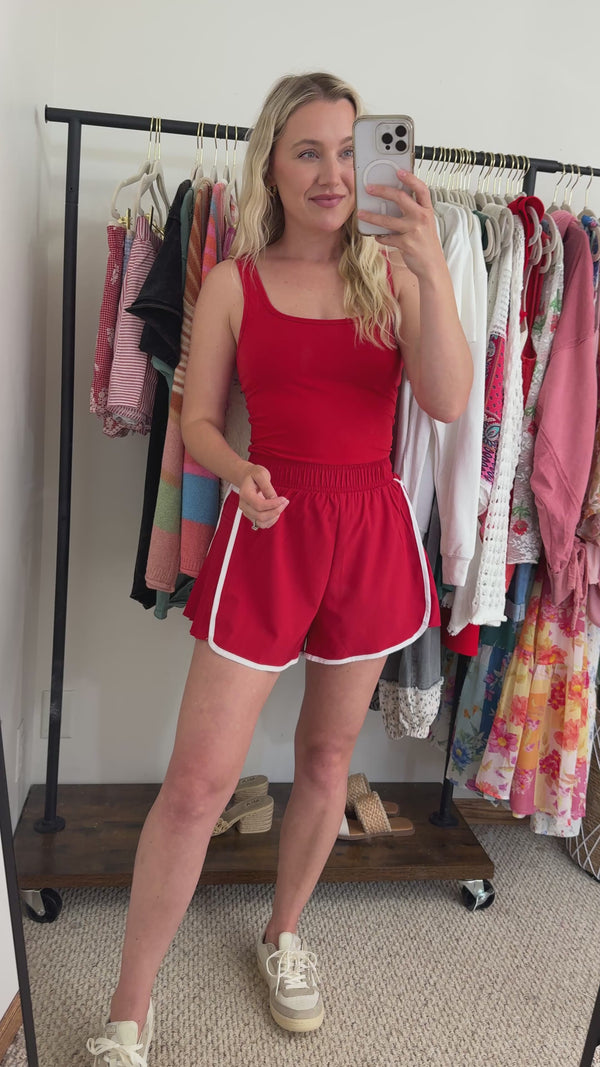 Rae Mode Red sporty romper with white piping, pleated shorts, and biker short lining with pockets—stretchy and soft one-piece outfit for active women